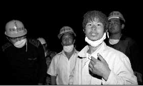 在歡呼和掌聲中,最后將馬元江抬出的上海消防局的消防隊(duì)員們,集合在了電視鏡頭前,消防員們盡情地表達(dá)著成功的喜悅。這時(shí),一名志愿者將尹春龍推到了記者們的面前。