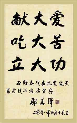 中新網(wǎng)5月21日電 據(jù)公安部網(wǎng)站消息,5月19日,中華全國(guó)新聞工作者協(xié)會(huì)第七屆名譽(yù)主席、《人民日?qǐng)?bào)》社原社長(zhǎng)邵華澤為全國(guó)消防官兵揮毫題詞:“獻(xiàn)大愛(ài)、吃大苦、立大功”,高度贊揚(yáng)消防官兵不怕?tīng)奚、不怕疲勞、英勇頑強(qiáng)的作風(fēng)。