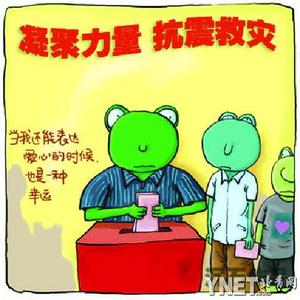 在天涯社區(qū)張貼的漫畫里,小鴨子表情嚴肅地對小雞說:“賑災(zāi)重建,長期任務(wù)”;三只小老鼠不停用鐵鍬挖坑蓋房,還拿著大喇叭高喊:“眾志成城,共抗震災(zāi)”;“蘑菇家族”的醫(yī)生則身背降落傘空降災(zāi)區(qū)……