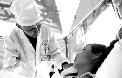 5月13日早上,什邡市第二人民醫(yī)院院內(nèi)的空地上臨時救治帳篷內(nèi),傷者正在吃著醫(yī)院分發(fā)的牛奶和雞蛋,1樓門過道也擠滿了受傷群眾的家屬。而過道上的另外一幕卻格外讓人感動:一張凳子旁邊立著一根鐵棒,鐵棒上掛著一瓶裝滿藥水的輸液瓶,一個身穿白大褂、頭發(fā)斑白、面容清瘦的醫(yī)生正在進行輸液治療。他就是累倒在手術臺,心跳停止長達1分鐘的張泮林教授!拔覀兌紕袼谂R時救治帳篷中進行治療,不要在外面,他堅決不干。他說,很多受傷群眾需要立即治療,不能占用病床!痹槲湔f,張泮林家在成都,他一個人在這里沒有人照顧,醫(yī)院提出找護士照顧他時,他也沒有同意。