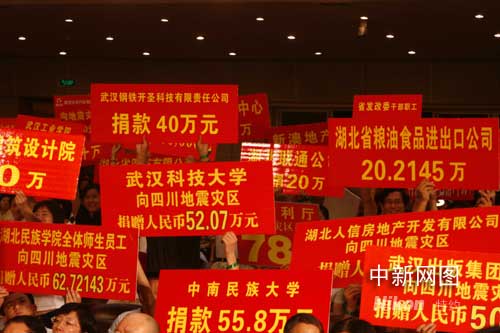 中新網(wǎng)武漢5月22日電 (記者 艾啟平)22日晚8點至11點,湖北省抗震賑災(zāi)晚會《我們心相連》在武漢洪山禮堂舉行。在晚會現(xiàn)場,中共湖北省委書記羅清泉、湖北省長李鴻忠等帶頭為四川地震災(zāi)區(qū)捐款,全省企業(yè)和社會各界及電視觀眾紛紛響應(yīng),截至晚會結(jié)束時共收到捐款超過一億元人民幣。