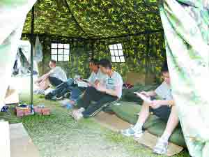 四川省北川中學(xué),這塊明顯有些泛舊的校牌,此時(shí)端正地懸掛在位于綿陽(yáng)市長(zhǎng)虹培訓(xùn)中心一座二層小樓的外墻上。培訓(xùn)中心的大門(mén)被拳頭粗的鐵鎖牢牢關(guān)緊,只有當(dāng)教職員工或記者進(jìn)出時(shí),才會(huì)擠出一條狹窄的縫隙。走進(jìn)其中,人們可以看到一座座整齊排列的綠色迷彩帳篷,不時(shí)會(huì)有孩子們擦身而過(guò)。他們的臉上沒(méi)有憂傷,盡管他們才剛從夢(mèng)魘中驚醒。