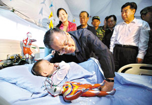 5月23日,溫家寶總理專程到綿陽(yáng)404醫(yī)院監(jiān)護(hù)室看望了3歲的小郎錚,稱贊他“堅(jiān)強(qiáng)、勇敢”。