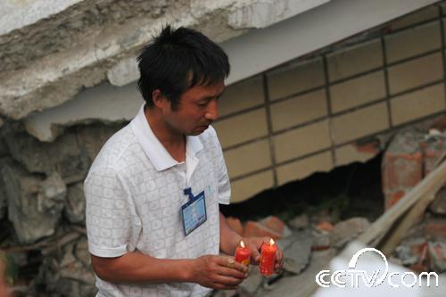 “孩子們,沒有全部救出你們我很內(nèi)疚,我會(huì)記住你們忌日的,每年的這一天我都會(huì)來看你們,給你們送學(xué)習(xí)用品。你們生前都很團(tuán)結(jié),在天堂也要相互關(guān)照好,老師每天都在想念著你們!”在北川中學(xué)(新區(qū))的廢墟下,記者看到一名中年男子跪在地上,哭得很悲傷,還向遇難的同學(xué)叩拜。記者跑過去一看,此人就是北川中學(xué)的校長劉亞春。他告訴記者,地震后他一直在忙碌搶救學(xué)生的事,沒有時(shí)間來看望這些還埋在廢墟下的數(shù)百名學(xué)生。今天他在百忙之中,抽時(shí)間來看看這些孩子們,他將帶來的蠟燭點(diǎn)燃后放在廢墟下,雙手合十,默默地祈禱,然后跪在地上給在地震中失去生命的學(xué)生磕了三個(gè)響頭。