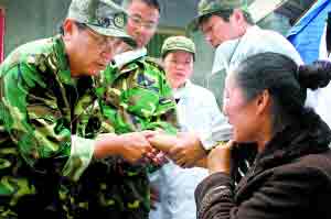 這邊的診斷才剛結(jié)束,那邊又傳來(lái)新的情況。有位年過(guò)八旬的老人跑過(guò)來(lái),請(qǐng)醫(yī)生到帳篷里為自己的女兒診治。將軍二話不說(shuō),立即派出心胸外科主任李魯跟著村民坐上自己的越野車(chē),直奔那位村民所住的帳篷!拔覀冞@個(gè)流動(dòng)醫(yī)療隊(duì)就是這樣,沿途看到哪里有災(zāi)民居住的帳篷,就會(huì)過(guò)去詢問(wèn)是否需要醫(yī)藥,使那些地處偏遠(yuǎn)或行動(dòng)不便的群眾能夠得到醫(yī)療救助!