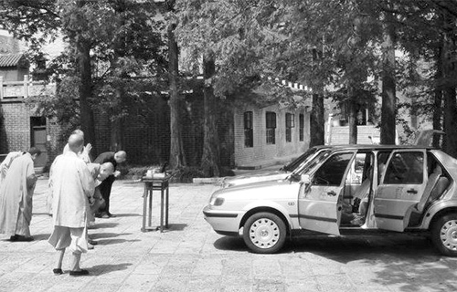 4月23日,星期三,一名網(wǎng)友在該山某寺門口發(fā)現(xiàn)兩輛掛著株洲牌照印有“衛(wèi)生監(jiān)督”字樣的車正在“開光”,兩輛車的所有車門和尾箱打開,儀式非常隆重。