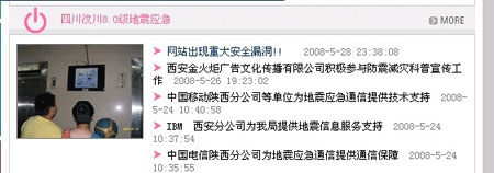 28日23時38分,記者正常登錄到陜西省地震局網(wǎng)站(陜西省地震信息網(wǎng))時,在該網(wǎng)站首頁“四川汶川8.0級地震應(yīng)急”欄目中發(fā)現(xiàn)一條題為“網(wǎng)站出現(xiàn)重大安全漏洞”的信息,點(diǎn)擊進(jìn)入后內(nèi)容顯示“本站由未知人員進(jìn)行檢測,存在重大安全漏洞”,并隨后附有三條“網(wǎng)友留言” 。