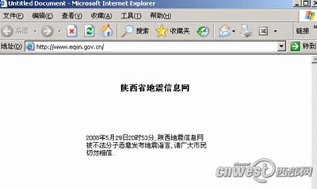 5月29日22點(diǎn)左右,記者登陸陜西地震局網(wǎng)站,已經(jīng)無法看到正常的地震信息網(wǎng)頁面。頁面上只有兩行簡單文字,“2008年5月29日20時53分,陜西地震信息網(wǎng)被不法分子發(fā)布地震謠言,請廣大市民切勿相信。”
