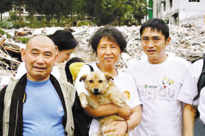 汶川大地震中,有兩只狗狗感動了全中國人。近日,這兩只在彭州銀廠溝一直舔著被困的王友瓊老人的嘴唇,使其在被困196個小時仍得以生還的“義犬”——“前進”和“乖乖”,被“愛之家”小動物保護中心在彭州當?shù)卣业,并被運回成都。至此,此前網(wǎng)上盛傳的這兩只“義犬”被殺、被吃的傳聞被打破。