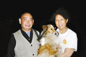通過智富,“愛之家”找到了黃色雜有黑毛的中華田園犬“前進”和黃白色長毛、背上有一撮黑毛、不足一歲的喜樂蒂狗“乖乖”。徐先生說,在將“前進”和“乖乖”帶離災區(qū)時,當?shù)睾芏啻迕穸技娂妵蟻硪蠛蛢芍弧傲x犬”合影。