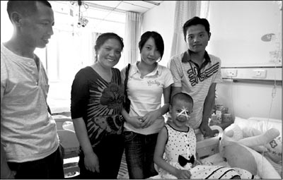 5月25日吃完午飯,一家人聚在小佳淇的病床前,本報記者為他們拍了張全家福。小佳淇爸媽和哥哥的表情都很僵硬,只有小佳淇笑得開心,還對著記者吐了吐舌頭。