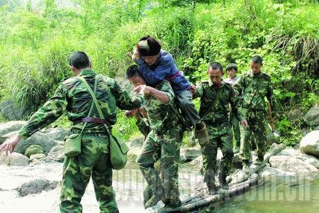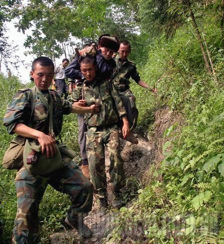 一大早,我們160人每人背著40公斤給養(yǎng)、物資、器材開(kāi)始翻越這座大山。政委說(shuō),茶坪老百姓需要我們。在翻越一個(gè)峭壁時(shí),列兵侯軍腳下一滑摔倒了,旁邊就懸崖,慶幸的是,除背囊隨著山石滾下山崖,侯軍本人安全地爬了起來(lái)。九個(gè)小時(shí)后,我們終于到達(dá)茶坪鄉(xiāng)。茶坪鄉(xiāng)副鄉(xiāng)長(zhǎng)張平一見(jiàn)到我們,就撲通一聲跪在了參謀長(zhǎng)面前說(shuō):“人民子弟兵來(lái)了,茶坪就有希望了……”參謀長(zhǎng)一把將他扶起,兩個(gè)漢子都淚流滿(mǎn)面。