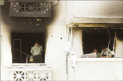 事發(fā)房間損毀嚴重,消防員在勘察現(xiàn)場。