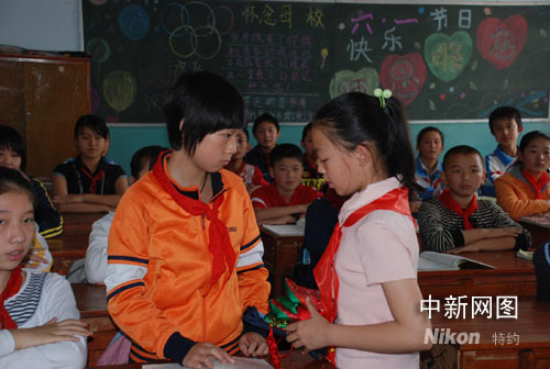 中新網(wǎng)吉林6月5日電(蒼雁)四川什邡地震災(zāi)區(qū)的女孩廖涵來吉林市投奔親屬,豐滿區(qū)英語實驗小學(xué)免費安置其入學(xué)。端午節(jié)前夕,吉林市另一所學(xué)校的一名12歲女孩帶著全班64名學(xué)生的心愿前去探望廖涵,并送去祝福荷包。