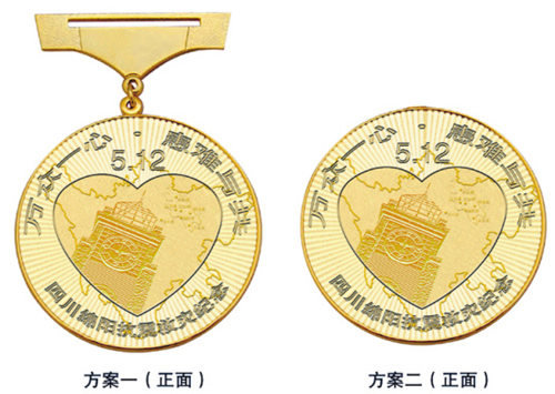 趙琛說,紀念章有著特殊的表現(xiàn)形式。內(nèi)輪廓為心型,代表全國人民萬眾一心支持綿陽賑災(zāi);外輪廓為圓形,象征太陽。整個紀念章的正面寓意為“心中太陽升起”,表達四川綿陽人民重建家園的信心和力量。