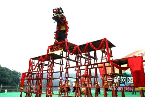 廣東南海西樵山上的天湖公園,一支來自廣東臺山的傳統(tǒng)南獅正在進(jìn)行絕技表演, “獅子踩沙煲”、“南獅勇闖鐵板橋”接連上演。