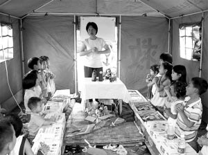 受災(zāi)群眾安置點(diǎn)的孩子們很多,分散在各個(gè)帳篷里,我給北京的志愿者老師說,我那有一頂帳篷,給孩子們當(dāng)教室吧,比這樣分散著強(qiáng),那頂帳篷我可以不用。
