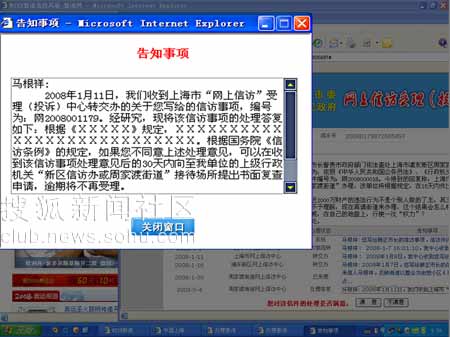 本報(bào)記者隨即與馬先生取得聯(lián)系,他當(dāng)著記者的面,用記者的電腦打開了在 “中國·上!闭W(wǎng)站上的信箱。記者看到信箱內(nèi)有自去年至今的來往信件,這些信件均反映周家渡街道侵占東明家園公建配套設(shè)施事宜。記者點(diǎn)擊了今年5月4日收到的標(biāo)題為 “周家渡街道網(wǎng)上信訪中心處理答復(fù) ‘馬根祥2008年1月11日……’”標(biāo)題的回復(fù)信件,在彈出的窗口中,被馬先生稱為 “史上最牛”行政回復(fù)隨即呈現(xiàn)在記者眼前: