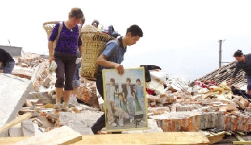 受災(zāi)群眾從廢墟中撿拾自己的東西,準(zhǔn)備重建家園。夏永 攝