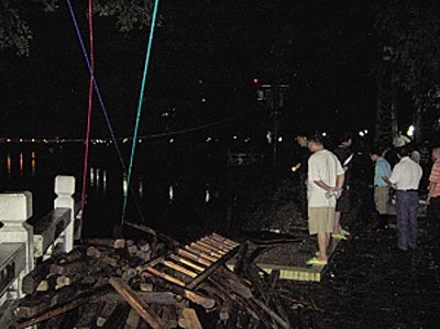 當(dāng)晚9時左右,記者在河邊看到,岸邊的防洪堤塌陷了20多米,垮塌現(xiàn)場已經(jīng)拉上了警戒線,河池市防汛抗旱指揮部的工作人員正在組織工人搬運(yùn)堆積在岸邊的竹竿和石塊等雜物,為下一步組織修補(bǔ)河堤做好準(zhǔn)備。另外,河堤垮塌段已經(jīng)派專人24小時守護(hù),以防出現(xiàn)更大的險情。