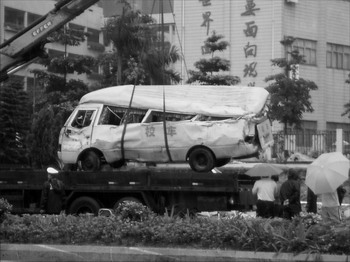 “我看見墻角冒出渾水,感覺圍墻就要倒了。馬上讓司機(jī)往前開,但車開動(dòng)不過10多秒,圍墻就真的倒了!弊蛱煸缟7時(shí)30分,虎門三中校門左側(cè)的一段圍墻在大雨中倒塌,重慶人彭必輝所乘坐的面包車也被磚石砸中;㈤T鎮(zhèn)有關(guān)部門稱,圍墻倒塌事故造成兩人死亡,13人受傷,兩名死者均為該校學(xué)生。