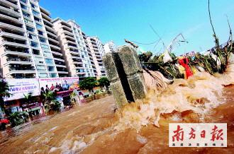 (廣東)省防總昨天下午4時的統(tǒng)計顯示,從5月25日至昨日8時,廣東大部分地區(qū)連續(xù)遭受強降雨的襲擊,全省平均降雨量為415毫米,是常年同期雨量的2倍多。降雨量超過1000毫米的站點有5個;超過500毫米的站點有424個,降雨范圍達5.3萬平方公里;超過300毫米的站點999個,降雨范圍達13萬平方公里。臺山市端芬鎮(zhèn)填坑站過程雨量1089.5毫米,深圳寶安石巖水庫前日降雨量415毫米,江門市獅山水庫站6小時雨量294.5毫米。