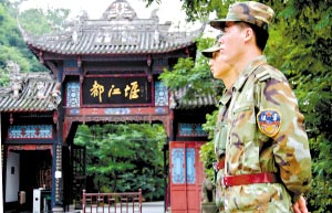 兩千多年前,秦蜀郡守李冰父子修建了雄偉的水利工程都江堰,使之成為巴蜀大地上偉大的防洪和灌溉工程,四川也因此成為富饒豐厚的“天府之國”。然而,5·12大地震不僅讓都江堰市區(qū)受損嚴(yán)重,世界文化遺產(chǎn)青城山-都江堰也在地震中遭到了不同程度的損壞。日前,在都江堰市街頭,舉目看去,絕大多數(shù)受損樓宇中皆人去樓空,而幽甲天下的青城山和澤被天府的都江堰景區(qū)也已暫時(shí)封門謝客,景區(qū)內(nèi)除了巡邏的解放軍戰(zhàn)士和救災(zāi)帳篷,已經(jīng)看不見一個(gè)游人。都江堰大壩旁的一條游客通道上,活動板房建設(shè)工人正在緊張施工,曾經(jīng)游人如織的景區(qū)道路上,靜靜豎起一大排藍(lán)白相間的板房。