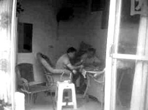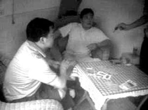 網(wǎng)友“善良老百姓”還在論壇里貼出兩張抓拍的照片:兩名穿藍色T恤的男子,拿著撲克坐在桌前,桌上散亂地鋪著現(xiàn)金;第三人的面目沒出現(xiàn)在畫面里,但可以見到其伸出的一只手。從照片的畫面判斷,拍攝者當時站在房間外。