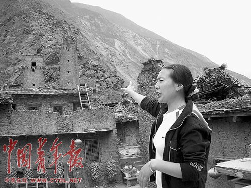 桃坪羌寨的羌族人掛念著附近山頂?shù)募焉秸?00多戶羌人的安危,有人從山上帶下來(lái)的消息說(shuō),上面房屋垮塌嚴(yán)重,有兩名正在房頂曬玉米的老人不幸罹難。
