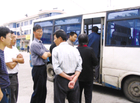 通知發(fā)出的第3天,進(jìn)入茅山集鎮(zhèn)的路口突然出現(xiàn)手持警棍的12名執(zhí)法隊(duì)員,他們一字排開,將路口封死,嚇得客車連忙下客,將乘客丟在雨中,匆匆回頭。第4天,司機(jī)們索性將車停在離集鎮(zhèn)入口100米的“高璟超市“門前,但執(zhí)法隊(duì)仍然進(jìn)行驅(qū)趕,無奈客車只好再退3.5公里,停在茶場一隊(duì)。見車主還是不交“保證金”,執(zhí)法隊(duì)繼續(xù)干預(yù),將客車又逼退1.5公里左右,停在茶場二隊(duì)。此地已經(jīng)距離茅山6公里左右,到了后白鎮(zhèn)境內(nèi)。但心有余悸的司機(jī)還是不放心,又向后退出1公里,索性停在茅西小鎮(zhèn)上。