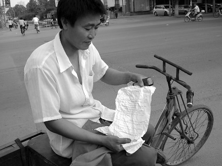 下午5點(diǎn)55分,記者終于見到了馬師傅,他看上去老實(shí)本分,裝扮樸素,鞋和褲子都已經(jīng)破了,蹬著一輛破舊的三輪車,眼睛有些紅腫,在接受民警詢問的時(shí)候,還不時(shí)惦記著回家收自己的菜攤。