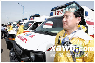 上午9時整,隨著演練活動總指揮王成文一聲令下,2008西安“城市聯動”反恐怖演練正式開始。在總指揮部的大屏幕上,實時圖像傳輸顯示:我市臨潼區(qū)兵馬俑附近突遭“恐怖分子”化學恐怖襲擊,一輛裝有不明液體的槽罐車發(fā)生爆炸并起火,現場中外游客400余人,其中20余名疑似中毒,情況緊急!