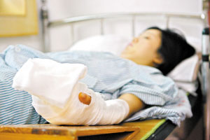 3名年輕女子在一家俱樂部唱完歌后遭一男子騷擾,在隨后的沖突中這名男子竟咬下其中一名女子的一截手指頭,另兩名女子也不同程度地受傷。昨日(29日)下午,記者在廣州和平手外科醫(yī)院見到了躺在病床上的劉女士。已接受再植手術(shù)的劉女士左手纏著厚厚的紗布,小指最上面一截已經(jīng)明顯發(fā)黑。