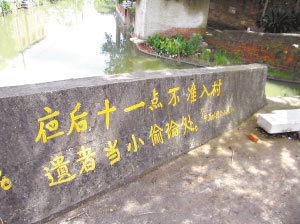 昨日上午,記者在現(xiàn)場看到了這條讓人哭笑不得的黃線,以及那條“嚴(yán)禁外地人,夜后11點不準(zhǔn)入村,遺(違)者當(dāng)小偷論處。元昌隊防偷小組示”的標(biāo)語。根據(jù)村委會干部的反映,這是20多戶人家集體制定的“新村規(guī)”。