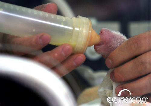 2008年7月7日上午,在中國(guó)保護(hù)大熊貓研究中心雅安碧峰峽基地,工作人員正在育嬰箱內(nèi),給大熊貓幗幗7月6日剛出生一對(duì)雙胞胎的老大,成功進(jìn)行人工進(jìn)食喂養(yǎng);而雙胞胎的老二目前則由大熊貓幗幗親自給它進(jìn)行母乳喂養(yǎng)。