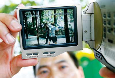 “開始我還以為他們是朋友之間在開玩笑!闭孪壬榻B說,在嘈雜的人聲中那名白衣男子后來抓住黑衣男子的一只手,并伸手到他的兩個褲子口袋里掏出兩瓶洗發(fā)液。隨后,章先生看到黑衣男子甩手給了白衣男子一耳光!安缓,他們動真格了。”章先生稱,他立即掏出隨身攜帶的DV機開始錄起現(xiàn)場來。
