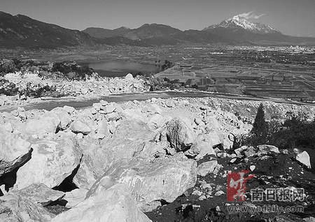站在麗江城區(qū)的高樓之上,向玉龍新城區(qū)與文筆海遠(yuǎn)眺,首先看到的便是文筆山青山綠水間面山的傷痛。遠(yuǎn)看似乎是一個(gè)采石場,走近才看清是一條盤旋的道路。