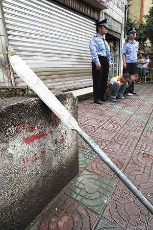 孔勁到達(dá)現(xiàn)場后,看到了觸目驚心的一幕:4名男子正在亂砸燒烤店的物品,其中一人揮著一把長約1.5米的大刀瘋砍,F(xiàn)場已經(jīng)倒下一名年輕男子,該男子頭部鮮血直流。