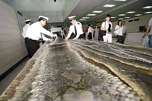 16張數(shù)米長(zhǎng)的蟒蛇皮,展開(kāi)鋪在海關(guān)查驗(yàn)臺(tái)上。日前旅客賴(lài)某想走私這些國(guó)家一級(jí)保護(hù)野生動(dòng)物蟒蛇皮進(jìn)境牟利,在拱北口岸就被查獲。這些蟒蛇皮每張長(zhǎng)度在3~5米左右。這是拱北口岸首次查獲旅客攜帶蟒蛇皮進(jìn)境走私案。(記者陳治家 通訊員黃慧賢、張建林?jǐn)z)
