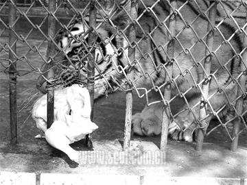 十指連心,動物也不例外;⒄其徸,猶如虎口撥牙。要想成功為“園園”實施剪指甲手術(shù),必須實施麻醉。前日上午10時,技術(shù)人員趁“園園”不備,用長竹竿綁上一顆大針頭,將4只陸眠靈麻藥快速推進(jìn)虎體。15分鐘后,“園園”雙眼時閉時睜伏在地上。不料,30分鐘后,“園園”突然起身,東倒西歪地走了起來!翱磥硭幜刻p,未能完全將它麻醉!10時38分,技術(shù)人員為“園園”補了一支麻藥,體重約150公斤的東北虎,兩腿一軟倒在地上再也爬不起來了。2名工作人員抓住時機,快速將“園園”的右腿拖出鐵欄外,并用繩索牢牢捆綁住虎掌,用鋼絲鉗將虎爪因定。只聽一陣“嘩!嘩!嘩”的拉鋸聲,一名工作人員就像鋸鋼管一樣,奮力朝著虎爪的第二只指甲猛鋸!拔耍∥!”就在工作人員即將鋸掉首枚虎爪時,劇烈的疼痛感將休眠中的“園園”痛醒,連續(xù)發(fā)出兩聲怒吼的同時,全身一陣猛抖,欲掙脫束縛拖回被綁的右掌。然而,5支麻藥的藥效已使此時的東北虎有心無力,徒勞一陣后進(jìn)入夢鄉(xiāng)。