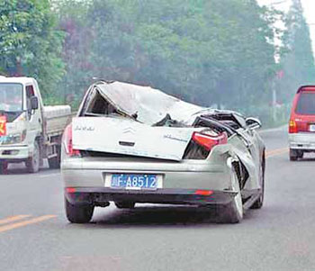 5月12日下午2時28分,突然地動山搖,而川FA8512所在的車棚則完全倒塌,塌下來的墻磚、預(yù)制板以及車棚鐵皮,重重砸在它的身上,并將其完全掩埋。第二天,一輛當(dāng)?shù)叵儡嚱?jīng)過門口,十多名消防官兵花了2個多小時,用切割機(jī)將預(yù)制板和鐵皮車棚切開,才將它救出。