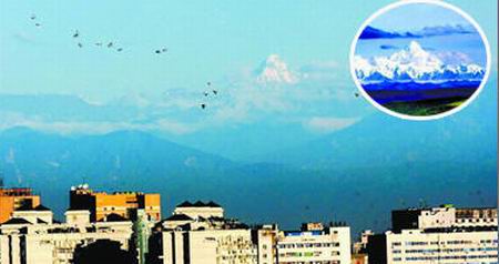 吳傳明將拍到的照片發(fā)到網(wǎng)上,在照片上可以清晰地看到:透過(guò)城市樓宇,蔚藍(lán)的天幕下出現(xiàn)了一大片群山。在群山深處,一座潔白的雪峰巍然矗立。尖利的山峰直刺云霄,圍繞在雪峰下的白云清晰可見……