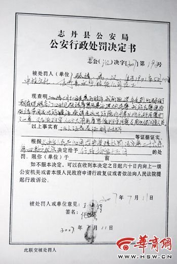 志丹縣公安局給張靜的公安行政處罰決定書