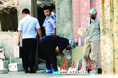 案發(fā)出租屋離同濟西路只有20米左右、離永豐大廈新一佳商場只有10米左右,出租屋所在的巷內(nèi)停有約10輛警車,警方設(shè)了兩道警戒線,數(shù)名刑警正在現(xiàn)場勘察調(diào)查,圍觀群眾有數(shù)十人。多名戴口罩的民警正在勘查取證,有民警甚至戴著面具。記者在外圍也能聞到一股臭味。