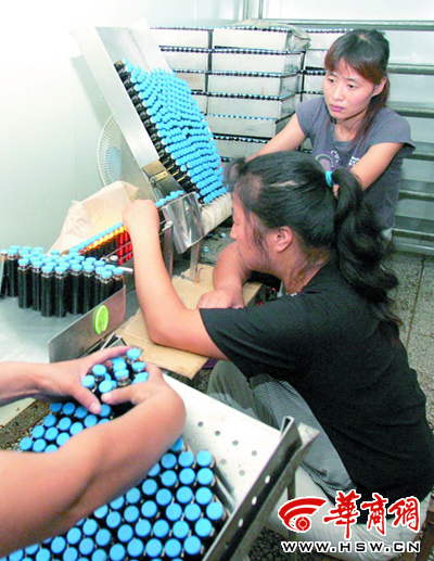 質(zhì)檢之后,褐色藥瓶隨著機(jī)器的轉(zhuǎn)動(dòng),滾動(dòng)在傳送帶上,一張張嶄新的標(biāo)簽被貼在嶄新的藥瓶上,標(biāo)簽被打上了2008年7月生產(chǎn)的字樣。