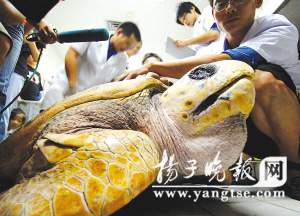 昨天上午9點(diǎn)鐘,海底世界搭起的手術(shù)室里十分安靜,呈現(xiàn)出土黃色的大海龜一動(dòng)不動(dòng)地趴在地上!昂穑稹,低沉而又艱難的呼吸聲讓人感覺(jué)到它異常痛苦。