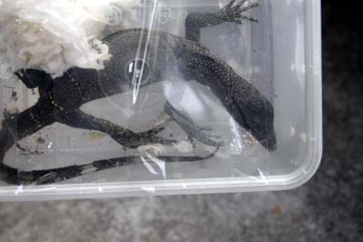 7月31日上午7時許,石井邊防派出所民警在泉州市南安石井碼頭對來靠臺灣貨輪進(jìn)行例行檢查時,在船上的洗浴間內(nèi)發(fā)現(xiàn)了兩個可疑的紙箱,紙箱內(nèi)有幾十個大小不一的塑料盒子,盒子內(nèi)裝有色彩繽紛、形態(tài)各異的蜥蜴、青蛙、烏龜?shù)扰佬袆游,約有200余只。隨后,邊防民警又在碼頭上抓獲了前來取貨的周某。