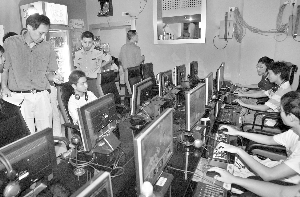 昨天上午10點,督查組一行來到位于中華路156號的“滿江紅網絡”進行突擊檢查!澳芸匆幌履愕纳矸葑C嗎?”一進門督查人員亮明了身份。突然一位工作人員立刻跑到了里面,緊接著從專區(qū)的一個門內呼啦啦一下跑出了四五十名學生模樣、神色慌張的年輕人。督查人員趕緊攔住一位正提著書包往外跑的學生,“你是來上網的嗎?”“不是,我是跟同學來這兒看別人玩的。”學生吞吞吐吐。督查人員進入這個專區(qū),只見配有幾十臺機器的專區(qū)只剩了兩個人,但是卻拿不出身份證。“在這兒上網是不用身份證的!逼渲幸恍』镒诱f。