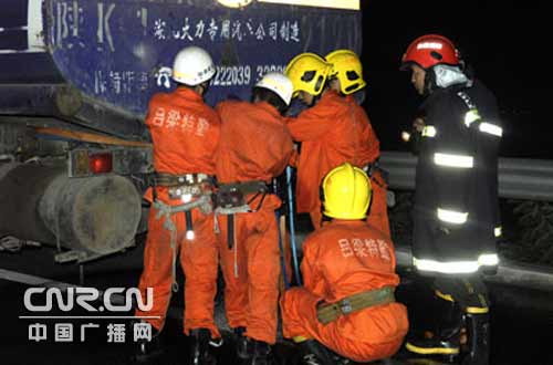 接到報警后,呂梁市消防支隊119指揮中心迅速調集6輛消防車,27名指戰(zhàn)員火速趕赴現(xiàn)場。經(jīng)詢問現(xiàn)場的知情人和對災害現(xiàn)場的初步偵察,得知一輛車牌號為陜K1910裝有24噸汽油的油槽車從陜西榆林運往山西呂梁市,在距離石高速口500米的下坡路段時與一輛大貨車發(fā)生追尾事故,車牌號為陜K1910油罐車卸油口被撞裂開一條大口,大量汽油呈噴射狀向外漏,沿高速路流淌距離長達1公里左右,此時只要有一點火星,就可能發(fā)生爆炸事故,高速路旁邊的居民區(qū)將夷為平地,情況萬分危機。