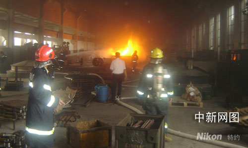 接到報(bào)警后,奉化消防大隊(duì)迅速出動(dòng)5輛消防車和23名官兵趕赴現(xiàn)場(chǎng)撲救。7點(diǎn)06分,官兵趕到現(xiàn)場(chǎng)。只見(jiàn)濃濃的黑煙已經(jīng)籠罩在了工廠的上空,透過(guò)車間的窗戶可以看到“火魔”正不斷地肆虐咆哮著,車間內(nèi)溫度很高,而且煙霧很刺鼻,根本無(wú)法靠近。